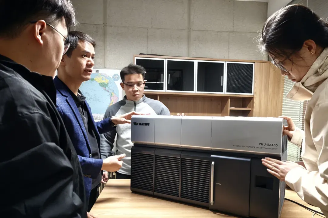 在海悟科技会议室内,工业设计团队围绕PHU—EA400整体式全天候节能机组产品的模型展开热烈讨论,从风机整体能效的优化,到AI寻优软件的算法调校,每一个细节都在反复推敲中不断打磨,力求精益求精,推动产品实现迭代升级和提质增效。PHU—EA400整体式全天候节能机组专用于中大型算力基础设施,产品采用高效低压比技术与双系统预冷+补冷的全新制冷架构,突破传统空调在过渡季节能效衰减的技术瓶颈,使机组在15~25℃典型工况下能效提升17%,全年综合能效比高达16.3,性能表现达到国际领先水平。